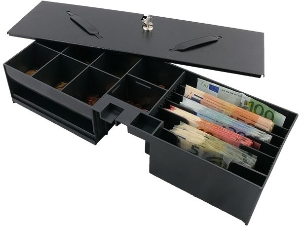 Cash drawer insert with 8 fixed coin compartments and 6 adjustable banknote compartments and cover with lock. With the help of the cover you can close the cash drawer insert to safely transport it from the cash register to the backoffice.