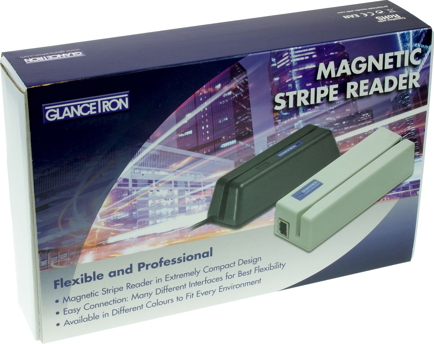 Compact multi-interface Glancetron 1290 magnetic card reader. Reads all three tracks on all magnet cards with the ISO standard. The Glancetron magnetic card reader is fully programmable using the supplied configuration tools and available in the colors black and beige/white.