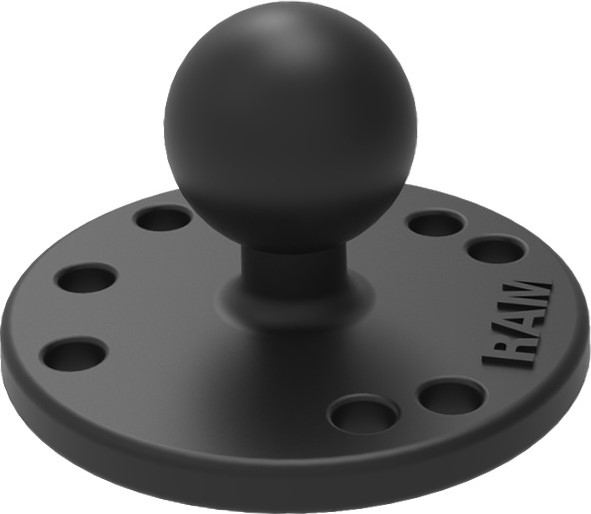 Round base plate with 25.4mm (1.00") ball. The base plate has pre-drilled holes, two in 180 degrees and three in 120 degrees.